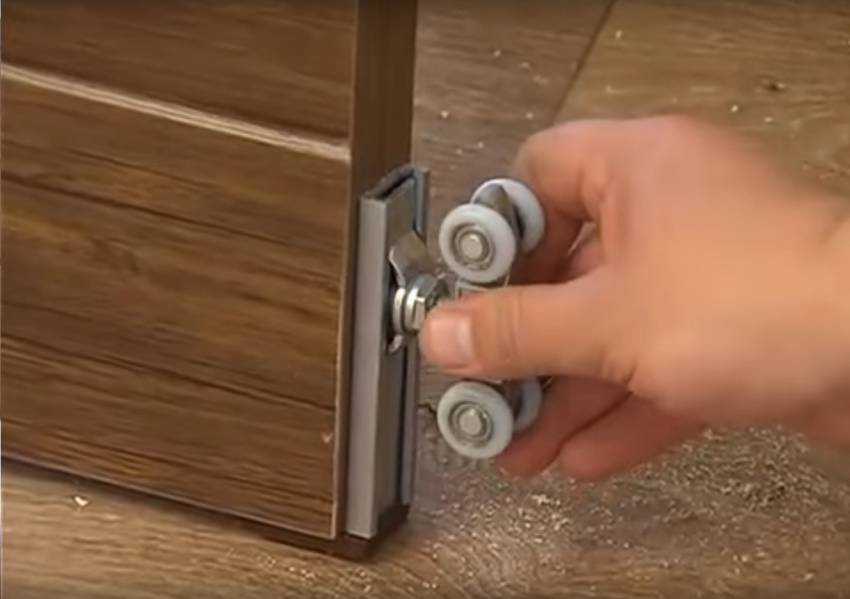 Шаг 2. Установка фурнитуры на дверное полотно. В торцах двери закрепляем ролики.