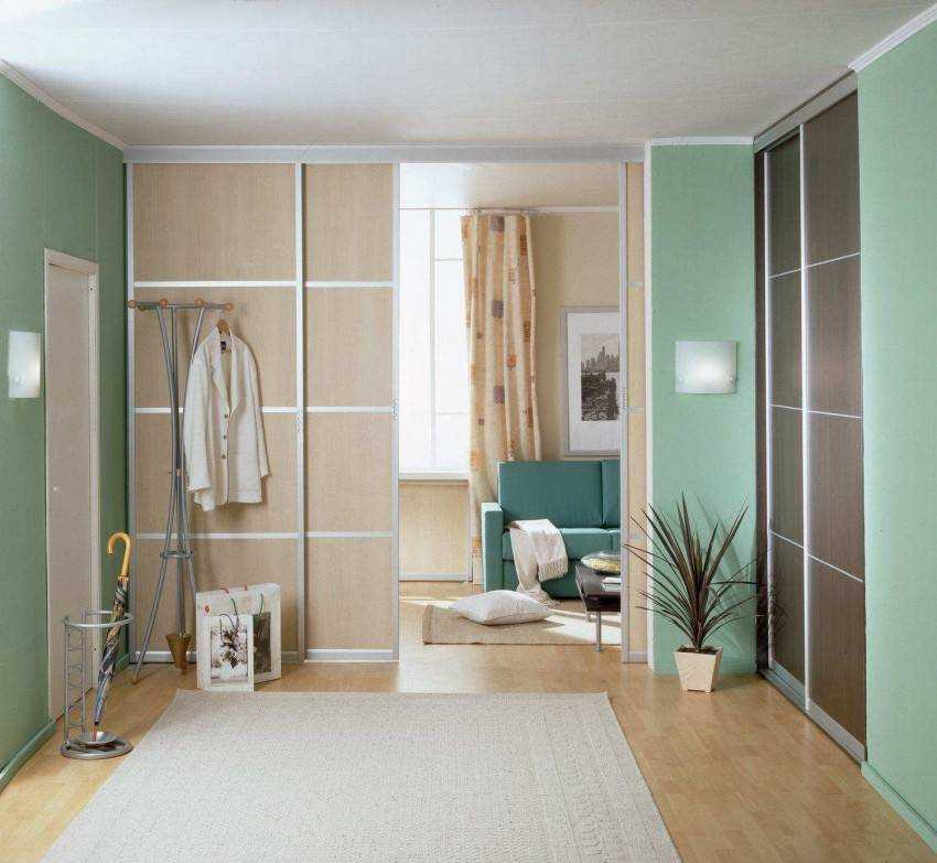 Еще один минус навесных раздвижных дверей – это то, что их перемещение вдоль стены не позволяет разместить вплотную к ней предметы мебели. Но если сделать в стене рядом с дверью нишу с полочками, то створка системы в раскрытом состоянии будет выполнять функцию дверки такого импровизированного шкафа. Этот вариант возможен, если проем сделан не в несущей стене.