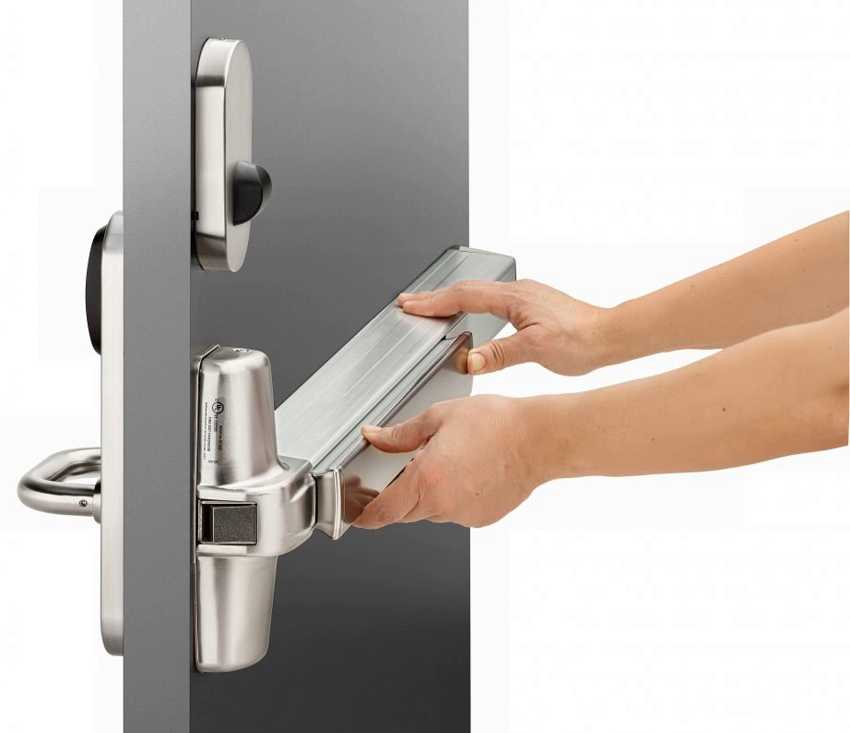 Эта система представляет собой металлическую конструкцию, оснащенную замком. Запирающий механизм надежно блокирует вход с наружной стороны с помощью ключа или автоматического блока управления. Благодаря этому исключается несанкционированное проникновение. При этом устройство легко и беспрепятственно открывает дверь с внутренней стороны помещения, достаточно лишь нажать на ручку.