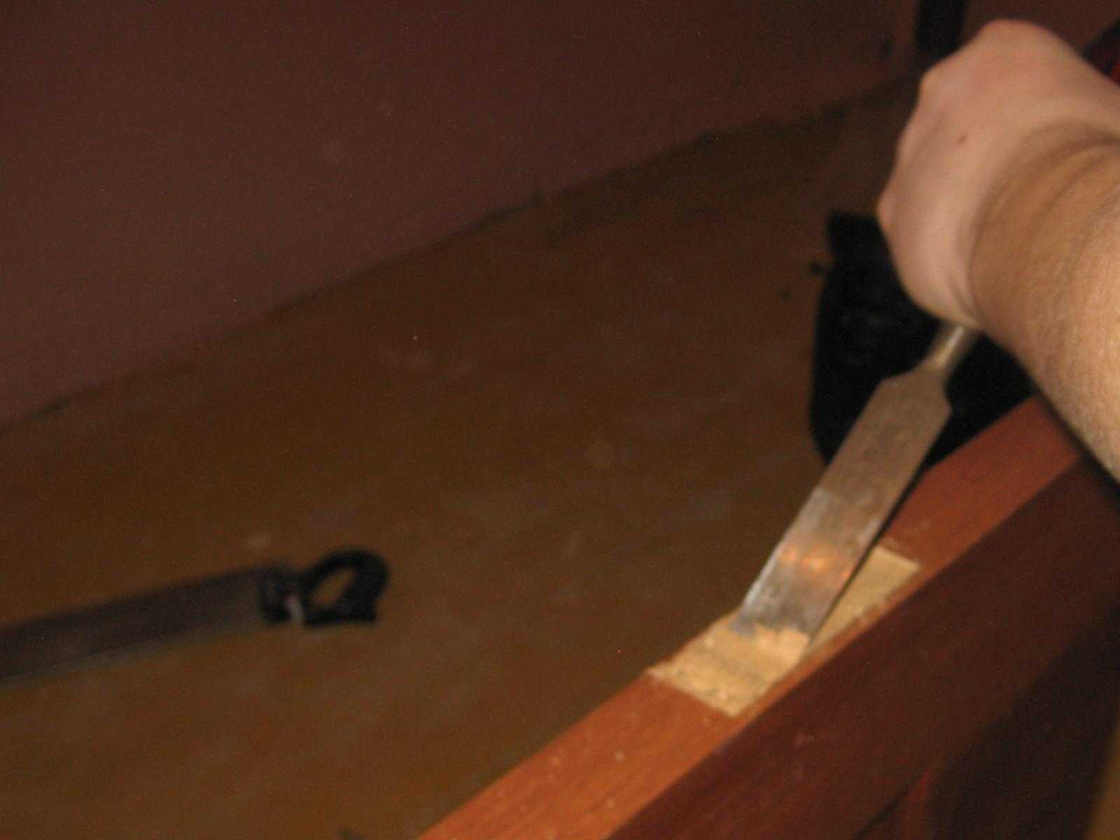 - У коробки обрабатывается горизонтальная часть. При этом с ее обоих концов удаляется выступающий кусок профиля. Делается это не просто так. Удаляют его в наибольшей части. Для этого делается пропил с помощью лобзика. После чего скалывается ненужная часть. Для этого с торца загоняется стамеска.