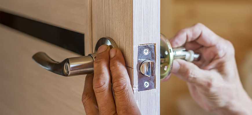 - Примеряют защелку, делают надрез по периметру передней накладки. Вынимают конструкцию. Стамеской и молотком формируют углубление для лицевой планки.