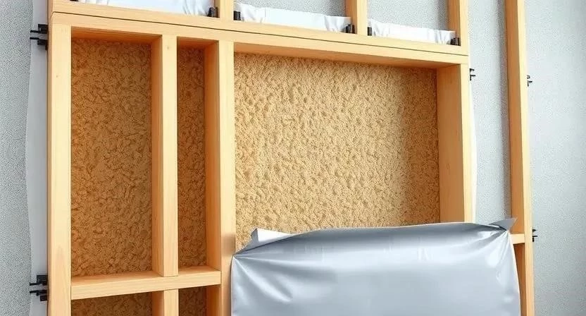 - Заполнение каркаса звукопоглощающим материалом: укладка минеральной ваты или других звукоизоляционных материалов.