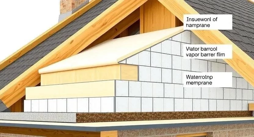 Гидроизоляция защищает утеплитель от влаги, которая может проникнуть снаружи. Монтируйте гидроизоляцию с внешней стороны крыши, поверх утеплителя. Используйте строительный степлер для крепления пленки к стропилам. Обеспечьте вентиляционный зазор между гидроизоляцией и кровельным покрытием.
