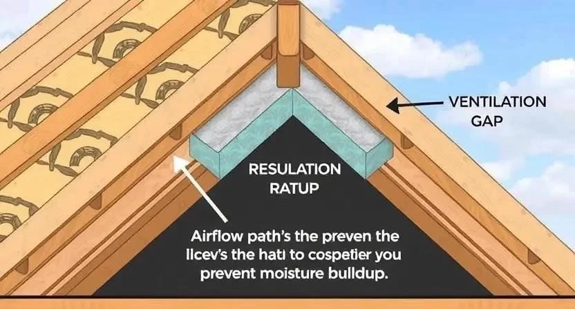 Ответ: Обеспечьте наличие вентиляционного зазора между утеплителем и кровельным покрытием. При необходимости установите приточные и вытяжные вентиляционные отверстия.