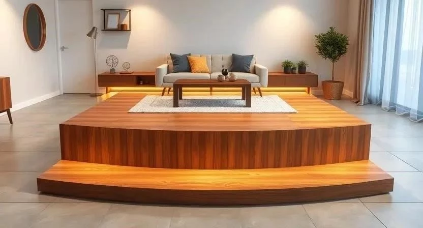 Ответ: Выбор материалов зависит от стиля интерьера и функционального назначения подиума. Для каркаса лучше использовать дерево или металл, для отделки – ламинат, плитку или ковролин.