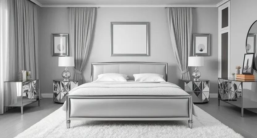 - Спальня: Серебряное постельное белье, прикроватные тумбочки, зеркала.