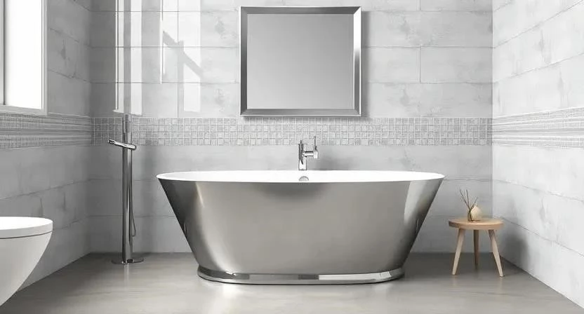 - Ванная комната: Серебряные аксессуары, зеркала, плитка.
