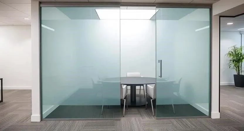 - Матовые стеклянные перегородки: Создают эффект приватности, рассеивая свет и скрывая происходящее за перегородкой.