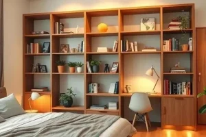 - Стеллажи: Отличный способ разделить комнату на зоны и одновременно организовать хранение вещей.
