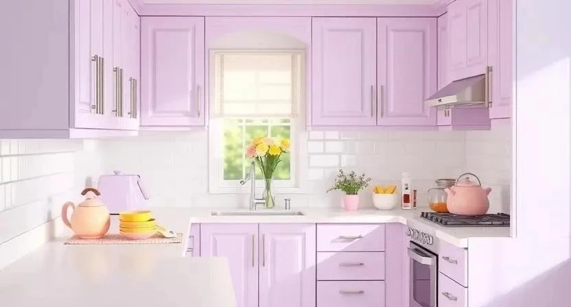 - Ванная комната: Пастельный лавандовый для стен, белый потолок и плитка нейтрального цвета.